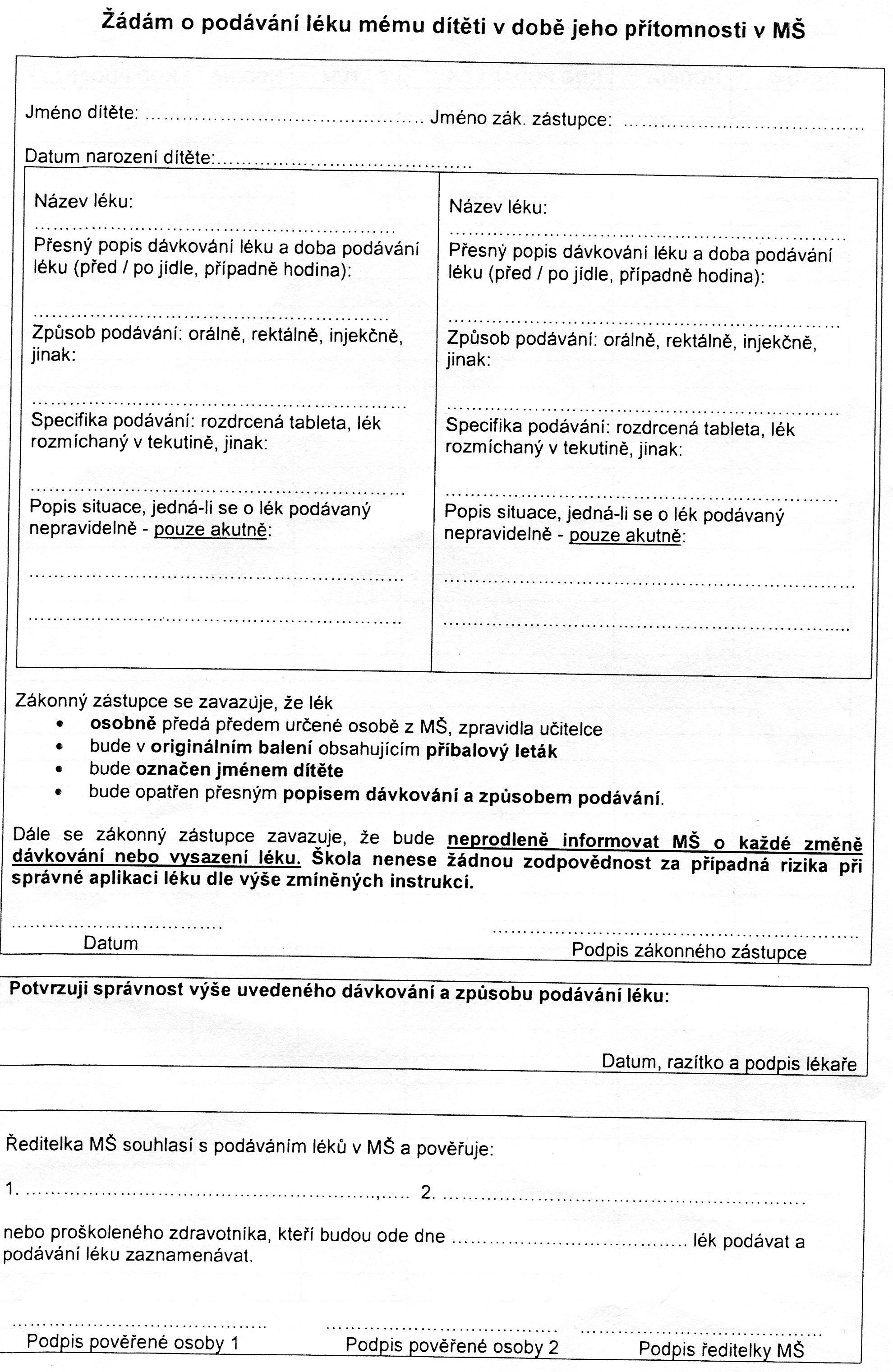 Vážený pane / Vážená paní / Vážení rodiče, níže naleznete návrh informačního formuláře s dávkováním léků pro dítě s epilepsií určený pro učitele a zdravotnický personál v případě odcestování dítěte na školní výlet. Přesné pokyny umožní personálu dodržet předepsané pravidelné užívání léku Vašeho dítěte.